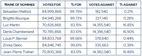 All of the proposed nominees for the Board of Directors in the proxy circular dated August 4, 2022 were elected at the Corporation’s annual and special meeting of the shareholders.